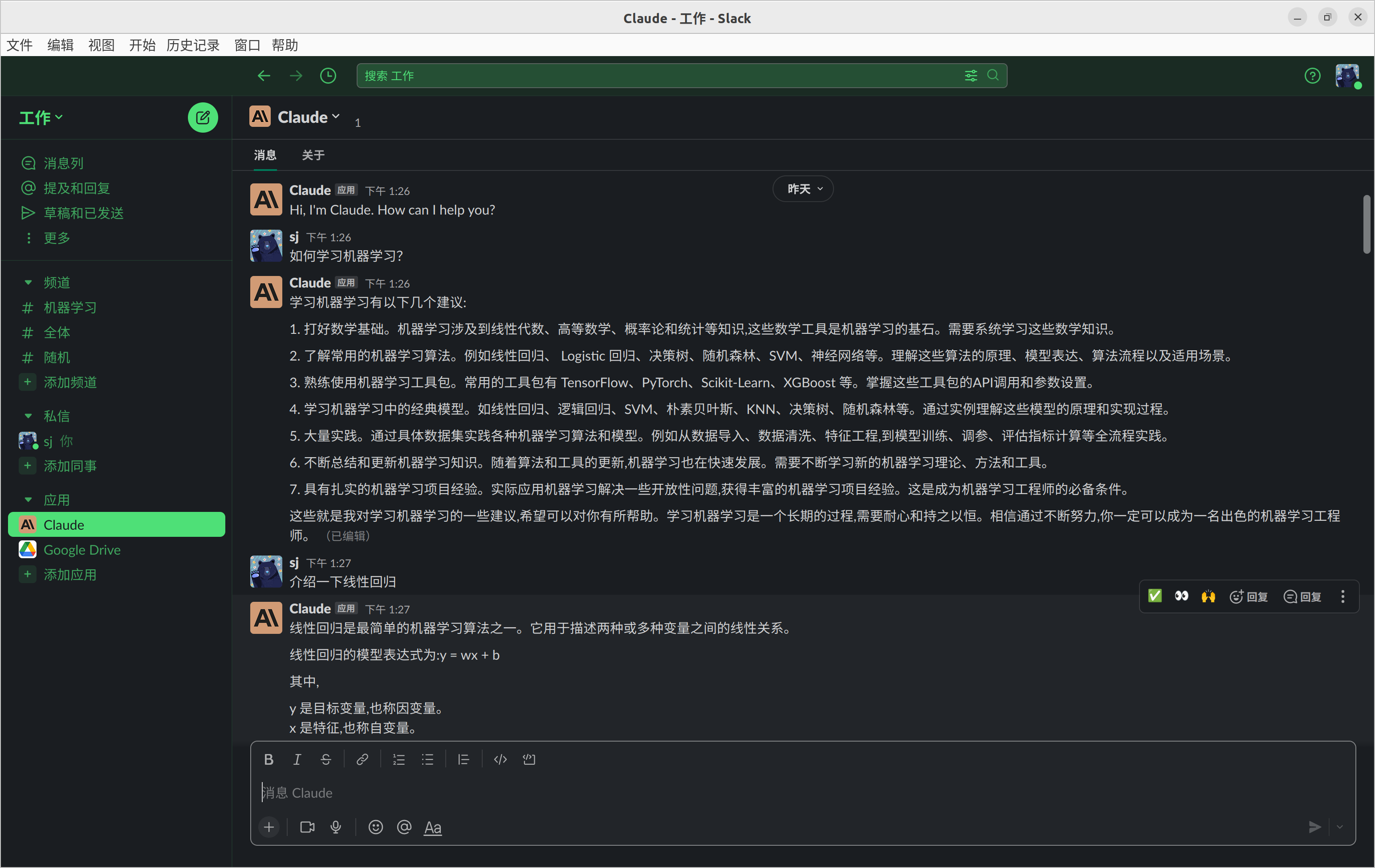 Claude是和GPT类似的模型,Ubuntu系统上体验很容易,应用商店里搜索安装Slack,然后在Slack里安装Claude应用,就可以体验了。